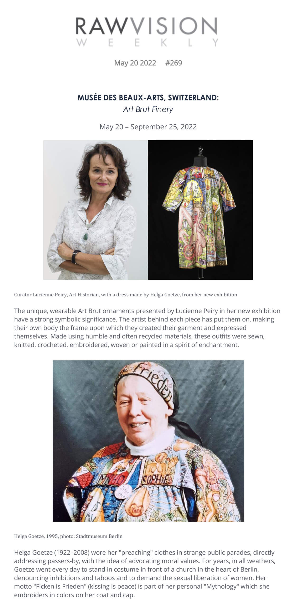« The unique, wearable Art Brut ornaments presented by Lucienne Peiry in her new exhibition have a strong symbolic significance. The artist behind each piece has put them on, making their own body the frame upon which they created their garment and expressed themselves. Made using humble and often recycled materials, these outfits were sewn, knitted, crocheted, embroidered, woven or painted in a spirit of enchantment. »